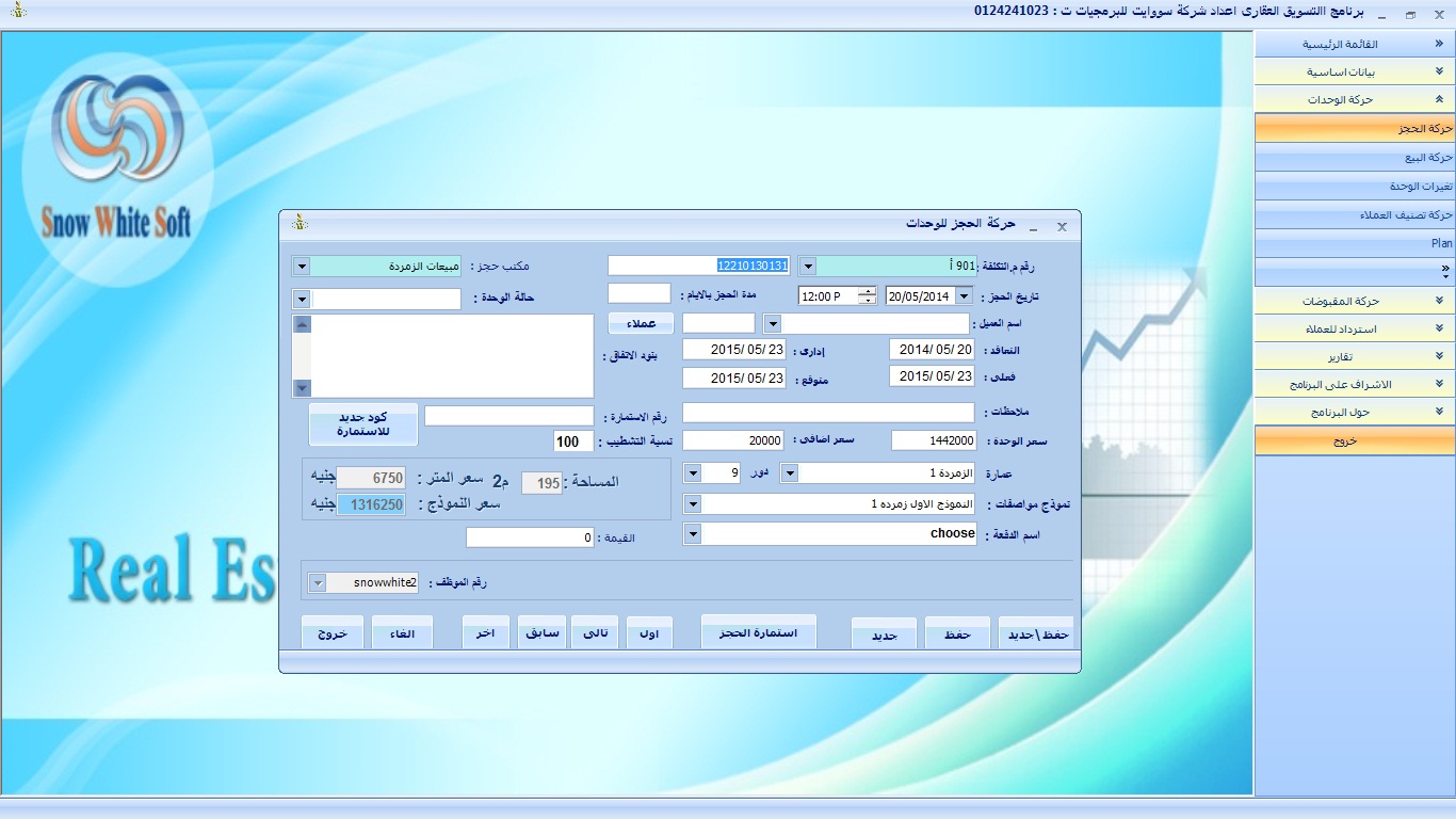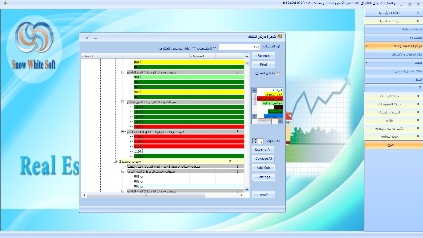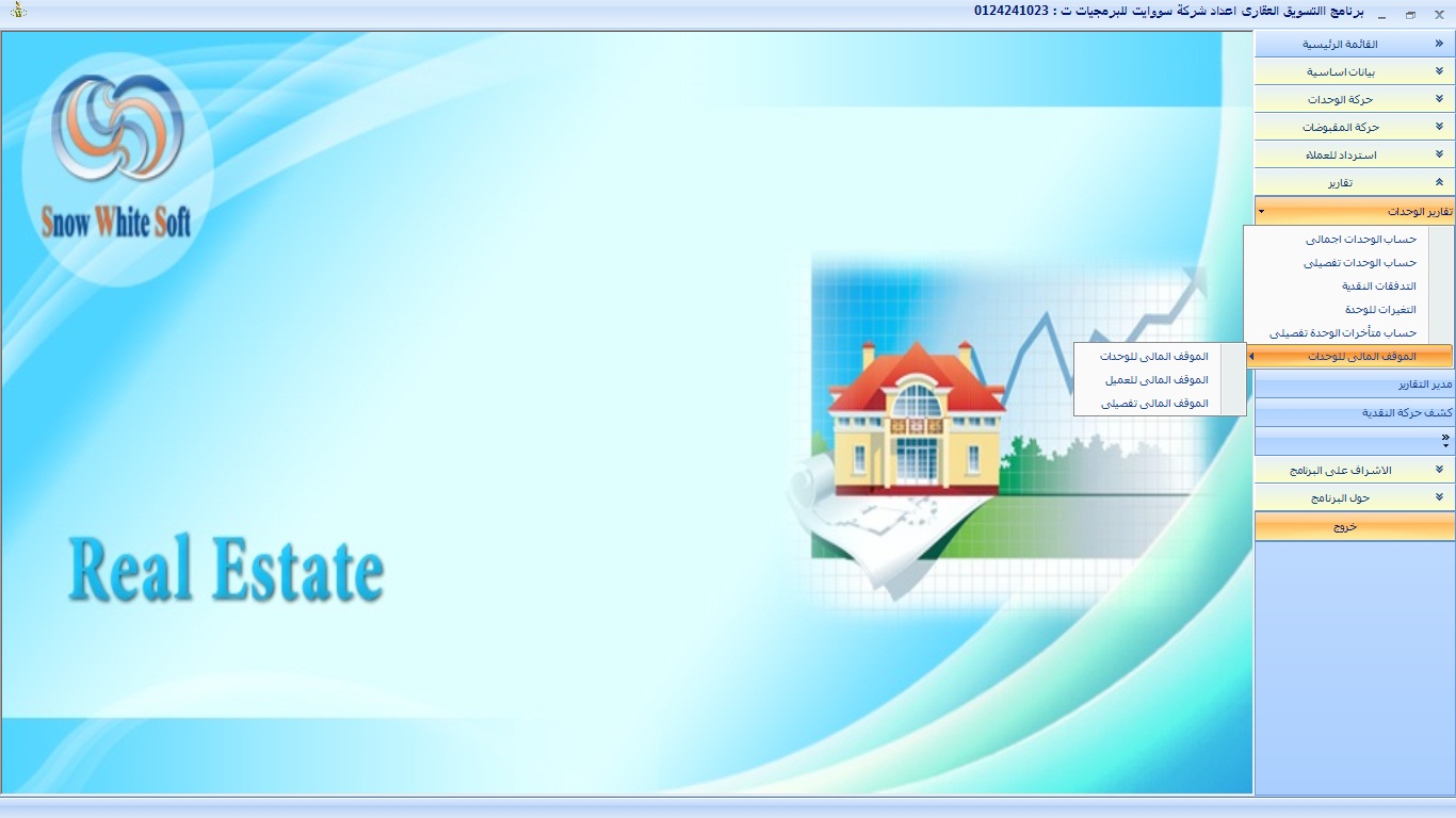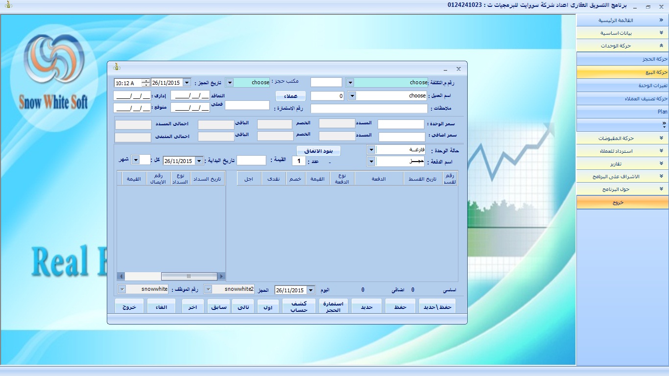 وهي كل ما يختص بموظفى التسويق ومتابعة العملاء من حساب وحدات ومبيعات وجدولة أقساط ومتابعة سداد وتقارير شاملة عن حالة العميل من حيث السداد (منتظم – متعثر) وحركة الوحدات وهناك أيضا تقارير مالية خاصة بالتدفقات النقدية لمشروع فى مرحلة ما سواء اسبوعيا او شهريا والتحصيلات السنوية وعملاء الاسترداد وفى النهاية عند دمج تقارير التكلفة مع تقارير المبيعات وعن طريق الرجوع لبرنامج الحسابات العامة نكون قد توصلنا لموازنة الكترونية وافية وموثقة بالايصالات والفواتير عن وضع المشروع المالى أو الموقف المالى للشركة بصفة عامة وهذا هو رجاء ومطلب كل صاحب شركة مقاولات او تسويق عقارى ان يسيطر ويتحكم فى المال المدفوع فى تنفيذ المشروعات المختلفة كذلك بناء رؤية مستقبلية بناء على تقارير بها ارقام حقيقية قبل ان تضع الشركة قدمها فى خطوات غير محسوبة قد تؤدى إلى خسارة ،أى أن البرنامج المتكامل فى مجال المقاولات والاستثمار العقاري والذي تقدمه شركة سنووايت لا بديل عنه لانه ببساطة بدونه