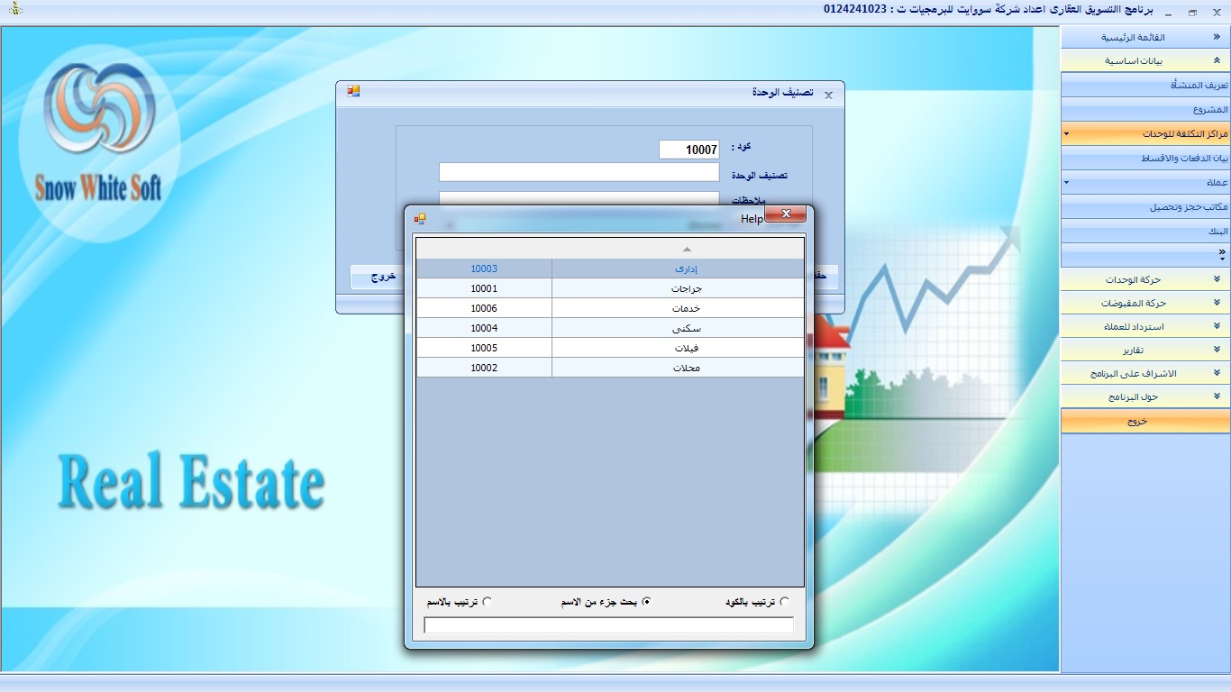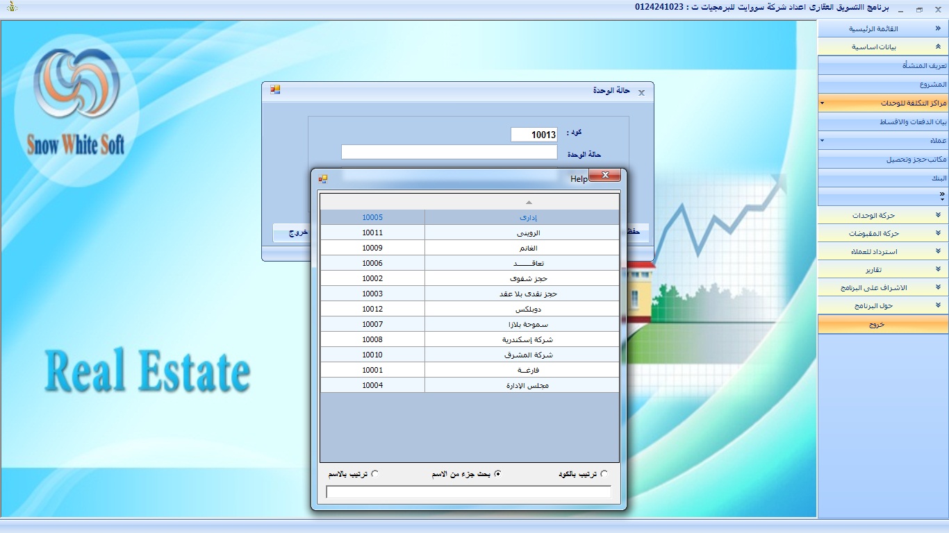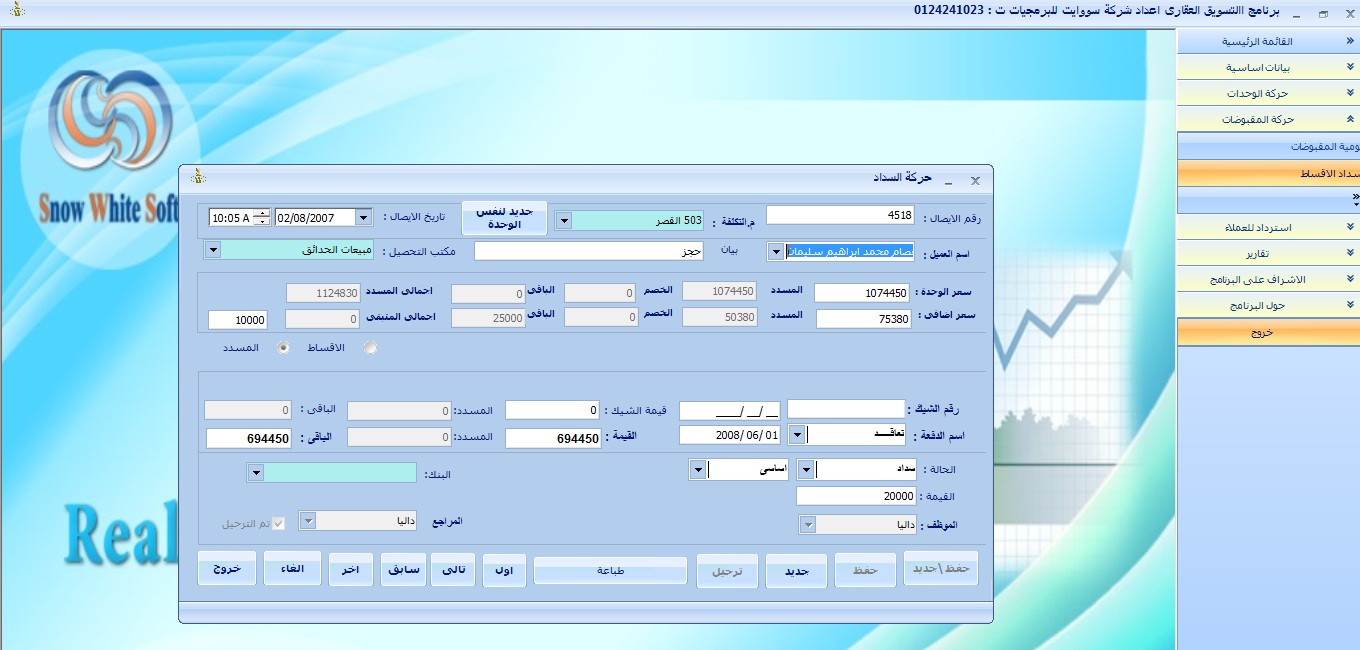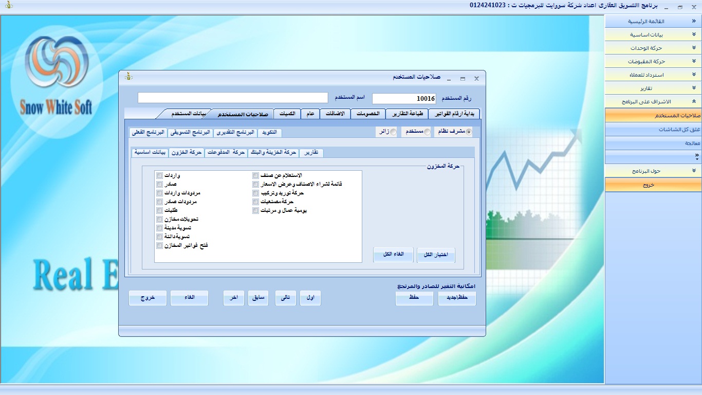 وهي كل ما يختص بموظفى التسويق ومتابعة العملاء من حساب وحدات ومبيعات وجدولة أقساط ومتابعة سداد وتقارير شاملة عن حالة العميل من حيث السداد (منتظم – متعثر) وحركة الوحدات وهناك أيضا تقارير مالية خاصة بالتدفقات النقدية لمشروع فى مرحلة ما سواء اسبوعيا او شهريا والتحصيلات السنوية وعملاء الاسترداد وفى النهاية عند دمج تقارير التكلفة مع تقارير المبيعات وعن طريق الرجوع لبرنامج الحسابات العامة نكون قد توصلنا لموازنة الكترونية وافية وموثقة بالايصالات والفواتير عن وضع المشروع المالى أو الموقف المالى للشركة بصفة عامة وهذا هو رجاء ومطلب كل صاحب شركة مقاولات او تسويق عقارى ان يسيطر ويتحكم فى المال المدفوع فى تنفيذ المشروعات المختلفة كذلك بناء رؤية مستقبلية بناء على تقارير بها ارقام حقيقية قبل ان تضع الشركة قدمها فى خطوات غير محسوبة قد تؤدى إلى خسارة ،أى أن البرنامج المتكامل فى مجال المقاولات والاستثمار العقاري والذي تقدمه شركة سنووايت لا بديل عنه لانه ببساطة بدونه