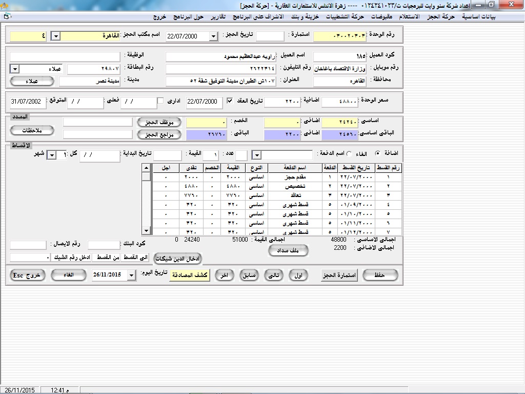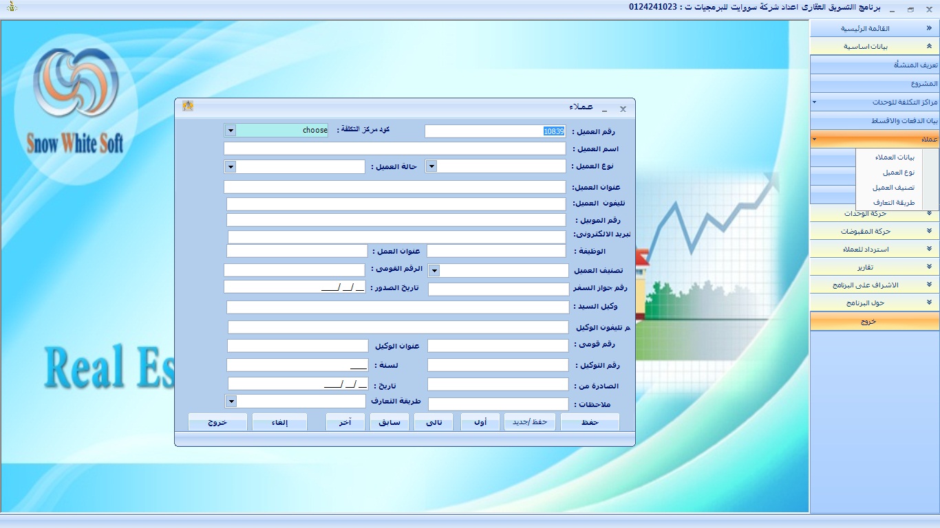 وفى النهاية وبعد ربط حسابات التكاليف مع حسابات المخازن مع الحسابات العامة يستطيع صاحب المؤسسة الاطلاع على تقرير يوضح له التكلفة النهائية للمشروع والذي على اساسه تحدد الربحية وسعر المتر التسويقى وطريقة التقسيط مما يقودنا للجزئية الاخيرة فى البرنامج وهي التسويق العقاري ومتابعة العملاء